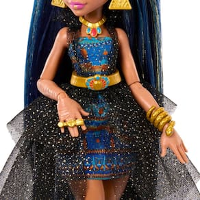 Boneca Monster High Monster Ball, Cleo De Nile em vestido de festa com acessórios temáticos, incluindo cetro e cupcakes — a boneca Cleo De Nile chega ao Monster Ball em estilo real. Ela arrasa em uma festa que certamente se destacará na terrível pista de dança de Monster High. - A roupa assustadoramente legal dessa múmia irradia um drama real. Seu minivestido estampado em cores vivas aparece nas dobras franzidas de uma brilhante sobreposição de tecido preto. - Cleo De Nile sai do sarcófago como uma rainha com sua bolsa Olho de Horus. Ela se abre para caber em sua pirâmide compacta em seu interior. - Seu cabelo cintilante está preso em um pônei alto, enquanto brincos de pirâmide, uma pulseira inspirada em cobra e saltos plataforma completam sua espreita. - Acessórios adicionais para contar histórias proporcionam uma festa fantástica: uma selfie em grupo para lembrar a noite, um adereço fotográfico com cetro e tiara e uma barraca de cupcake de três camadas com um garfo. - Esta boneca Monster High Cleo De Nile é uma adição assustadora a qualquer caveira. Crianças e fãs podem conferir os outros ghouls de Monster Ball para uma diversão mais assustadora.