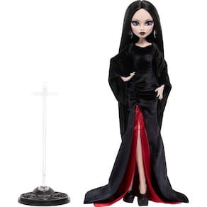 Esta boneca colecionável Morticia Addams da coleção Monster High x Wednesday captura a elegância sombria e o charme misterioso da icônica personagem. Vestida com um luxuoso vestido de veludo preto com mangas sino fluídas e detalhes franzidos, o traje é realçado por uma saia interna de cetim carmesim que cai dramaticamente até o chão, evocando um estilo gótico e sofisticado. Seu cabelo preto e liso emoldura um rosto com maquiagem acentuada em roxo e manicure preta polida, incorporando o fascínio sombrio da série.