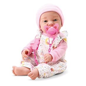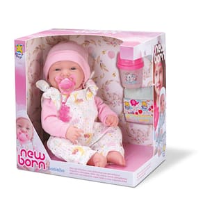 Contém: 1 Boneca, 1 Mamadeira, 1 Fraldinha e 1 Chupeta.