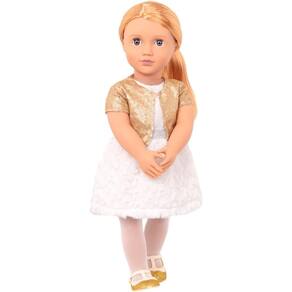 A Hope está sempre pronta para comemorar com os amigos e família! Ela é cheia de brilho e amor. Vem vestida com a sua melhor roupa de festa, pronta para celebrar. Ela veste um lindo vestido branco com uma saia de pele sintética. Usa um casaco de lantejoulas douradas e completa seu look com meia-calça branca e sapatos sociais com detalhes em dourado. Hope é uma linda boneca com longos cabelos loiro-avermelhados e olhos cinza únicos. Seu pescoço, ombros e quadris giram para que ela possa se mover de muitas maneiras diferentes! Hope está pronta para fazer uma nova amiga! Our Generation não se trata apenas de uma boneca, um lindo conjunto de roupas ou mesmo um kit de acessórios fantásticos. É sobre incentivar crianças de todos os estilos e gostos a criar suas próprias histórias, desenvolvendo um universo ilimitado de brincadeiras com bonecas e acessórios. Sua embalagem é feita de material reciclado, especialmente desenvolvida para uma geração mais ecológica que não aceitaria nada menos. Essa é a nossa história, e essa é a nossa turma! Inclui: boneca, bolerinho dourado, vestido branco, meia-calça, sapatos.