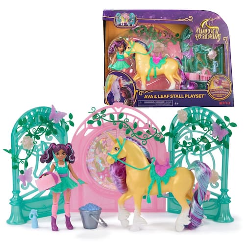 Unicorn Academy, Brinquedo de boneca Ava e folha que muda de cor com 15 acessórios, bonecas e brinquedos de unicórnio para meninas a partir de 4 anos - Suporte de unicórnio e brinquedo de boneca: baseado no popular programa Netflix e livros infantis mais vendidos, este conjunto detalhado inclui Ava de 11,4 cm, folha de mudança de cor de 12,7 cm e 15 acessórios - Brinquedo de unicórnio que muda de cor: Recrie Leaf ganhando seus poderes – mergulhe a esponja em água gelada e aplique em seu corpo para revelar magicamente as marcas Plant Magic. A sela e o freio da Leaf também são removíveis para brincar de conta adicional - 15 acessórios para bonecas: decore a barraca com borboletas, flores e videiras. Adicione à sua narrativa com um frasco de spray que a Ava pode segurar, a esponja, o balde de frutas celeste para a folha para lanche e escova para a crina e cauda sedosas da Leaf - Colecione todos: construa sua coleção de bonecas e acessórios Unicorn Academy com todos os conjuntos de cavaleiros e unicórnios (brinquedos femininos vendidos separadamente). Presentes divertidos de unicórnio, presentes de aniversário ou presentes para qualquer ocasião - ENCANTANTES Cesto de páscoa: Encha sua cesta de Páscoa com bonecas, unicórnios, bichos de pelúcia e muito mais. Brinquedos de unicórnio emocionantes para meninas de 4 a 6 anos ou mais - Inclui: 1 brinquedo, 1 boneca, 1 unicórnio, 1 sela removível, 1 freio removível, 15 acessórios - Coberto pelo compromisso Spin Master Care. Veja abaixo os detalhes completos