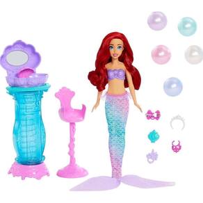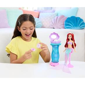 A boneca Disney Princesa Ariel com Acessórios Surpresa e sua penteadeira repleta de surpresas em peças de encaixar vão encantar os fãs de A Pequena Sereia, da Disney Inspirada na adorada personagem da Disney, a boneca Ariel usa uma cauda de sereia macia e removível e tem cabelos que podem ser escovados para você se divertir com o estilo A penteadeira com tema do mar contém 5 pérolas, cada uma com um acessório surpresa exclusivo. Basta abrir a penteadeira para iniciar a mágica das peças de encaixar