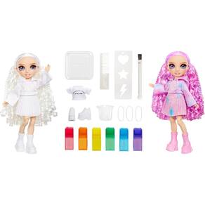 O que está incluído: 1 boneca fashion exclusiva com roupa completa de boneca branca e sapatos de boneca, top de boneca bônus, tênis de boneca bônus, 6 aquarelas laváveis arco-íris, esponja de aplicação de duas pontas, elásticos de borracha, estêncil, copo medidor, tigela descartável, colher e pente.
