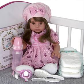 Conteúdo: - 01 Boneca Castanho - 01 Mamadeira - 01 Chupeta - 01 Predendo de Chupeta - 01 Kit Pente e Escova - 01 Conjunto De Roupa De Luxo - 03 Fraldas - 01 Manual de Cuidados - 01 Certidão Nascimento - 01 Certidão de Vacinação - 01 Exame do Pezinho - 01 Sapatinho Variado com Disponibilidade do Estoque