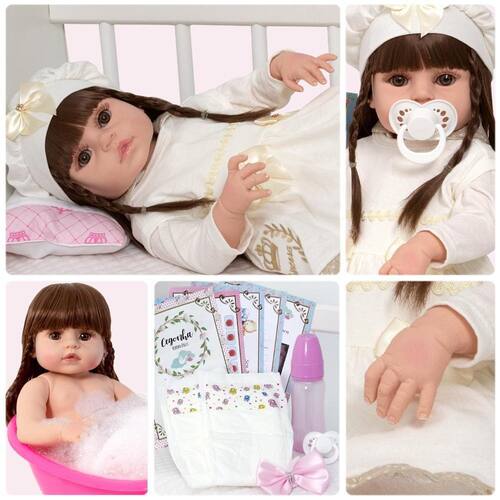 A nossa empresa tem a missão de garantir a total satisfação de seus clientes, onde a qualidade e o atendimento excepcional são nossa prioridade Estamos muito felizes em apresentar a Boneca Bebê Reborn para você, um item cuidadosamente selecionado para atender às suas necessidades. Compre agora e experimente a diferença em comprar com a nossa loja.A Boneca Bebê Reborn é o sonho das meninas Produzida 100% em vinil siliconado, essa boneca pode sentar, deitar e fazer tudo que a sua imaginação deixar. Com seus olhos castanhos e detalhes realistas ela é encantadora e apaixonante. Sua criança merece a melhor qualidade de bebê reborn Marca: Cegonha Reborn DollsModelo: Boneca Bebê Reborn Cor: BegeMaterial: Vinil Siliconado AtóxicoCaracterísticas Principais: Membros Articulados, Corpo de Silicone, Detalhes Realistas.Medidas Aprox.: Altura da Boneca: 46cm Peso Aprox. Da Boneca: 0,745 Kg Certificado INMETRO Recomendado para crianças maiores de 03 anosConteúdo:1 Bebê Reborn Cabeça, Membros e Corpo de Vinil 1 Conjunto de Roupa Luxo1 Par de Cílios1 Par de Brinco1 Chupeta1 Mamadeira Simples5 Certificados2 Fraldas1 Laço CetimGarantia30 dias de garantia oferecida pelo fabricante.Dúvidas Frequentes:1. Ela acompanha ItensR. Sim, todos os itens da descrição.2. Ela emite algum somR. Não, ela não emite nenhum som.3. Pode dar banho na bonecaR. Sim, pois o material do corpo é de Silicone.4. Pode escolher a cor dos olhos da bonecaR. Não, os olhos já vêm de fábrica.5. Tem disponibilidade de estoque imediatoR. Sim, temos disponibilidade de estoque imediato.Tags: Realista, Menina, Infantil, Silicone, Princesa, Linda, Morena, Loira, Fofa, Banho, Enxoval, Completo, Grande, Baby Alive.