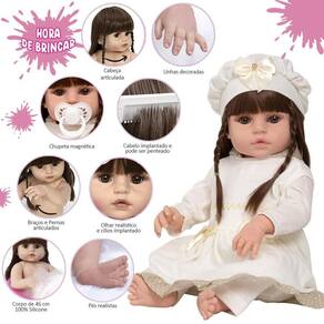 A Boneca Bebê Reborn é o sonho das meninas Produzida 100% em vinil siliconado, essa boneca pode sentar, deitar e fazer tudo que a sua imaginação deixar. Com seus olhos castanhos e detalhes realistas ela é encantadora e apaixonante. Sua criança merece a melhor qualidade de bebê reborn