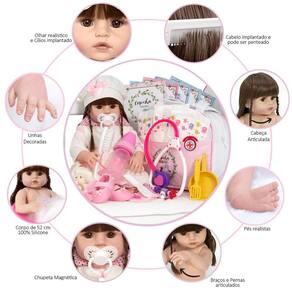 A nossa empresa tem a missão de garantir a total satisfação de seus clientes, onde a qualidade e o atendimento excepcional são nossa prioridade Estamos muito felizes em apresentar a Boneca Bebê Reborn para você, um item cuidadosamente selecionado para atender às suas necessidades. Compre agora e experimente a diferença em comprar com a nossa loja.A Boneca Bebê Reborn é o sonho das meninas Produzida 100% em vinil siliconado, essa boneca pode sentar, deitar e fazer tudo que a sua imaginação deixar. Com seus olhos castanhos e detalhes realistas ela é encantadora e apaixonante. Sua criança merece a melhor qualidade de bebê reborn Marca: Cegonha Reborn DollsModelo: Boneca Bebê Reborn Cor: BegeMaterial: Vinil Siliconado AtóxicoCaracterísticas Principais: Membros Articulados, Corpo de Silicone, Detalhes Realistas.Medidas Aprox.:  Altura da Boneca: 52cm Peso Aprox. Da Boneca: 0,745 Kg Certificado INMETRO Recomendado para crianças maiores de 03 anosConteúdo:1 Bebê Reborn  Cabeça, Membros e Corpo de Vinil 1 Conjunto de Roupa Luxo1 Par de Cílios1 Par de Brinco1 Chupeta com Artesanato1 Mamadeira Luxo5 Certificados3 Fraldas1 Laço Cetim2 Presilhinha1 Par de Luvas1 Bolsa Maternidade1 Prendedor de ChupetaKit Pente e Escova com Artesanato1 Kit medico1 Sapatinho c Laço1 Kit Panelinha 1 UrsinhoGarantia30 dias de garantia oferecida pelo fabricante.Dúvidas Frequentes:1. Ela acompanha ItensR. Sim, todos os itens da descrição.2. Ela emite algum somR. Não, ela não emite nenhum som.3. Pode dar banho na bonecaR. Sim, pois o material do corpo é de Silicone.4. Pode escolher a cor dos olhos da bonecaR. Não, os olhos já vêm de fábrica.Tags: Boneca, Bebe, Reborn, Realista, Menina, Infantil, Silicone, Princesa, Linda, Morena, Loira, Fofa, Banho, Enxoval, Completo, Grande, Baby Alive.Homologação Inmetro: IP-BRI-8778/2018-06