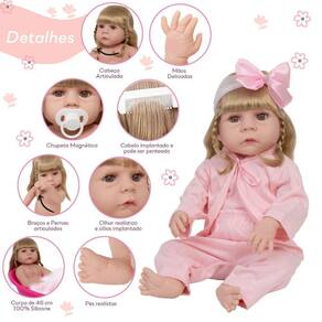 A Boneca Bebê Reborn é o sonho das crianças Produzida 100% em vinil siliconado, essa boneca pode sentar, deitar e fazer tudo que a sua imaginação deixar. Com seus olhos castanhos e detalhes realistas ela é encantadora e apaixonante. Sua criança merece a melhor qualidade de bebê reborn