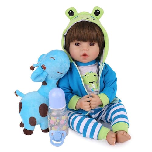 O bebê reborn mede centímetros da cabeça aos pés, com corpo macio e pesado para uma sensação de bebê real, as crianças podem levá-la para qualquer lugar. A boneca pode caber em roupas de bebê de tamanho recém-nascido (0 a 3 meses). O bebê Reborn tem uma aparência realista. Olhos azuis aplicados à mão, lindos cabelos castanhos feitos à mão. Os braços e as pernas podem ser movidos e articulados. A expressão de aparência real fará com que seus filhos sintam vontade de brincar com amigos. As bonecas são uma ótima escolha para presente de aniversário infantil, presente de Natal, pré-escola e atividade doméstica, dramatização e brincadeiras de nutrição. A boneca Reborn também é uma boa escolha para a coleção de acompanhantes e colecionadores da vovó. A cabeça da boneca, braços de vinil 3/4 e pernas de vinil 3/4 estão em conformidade com os requisitos de segurança da ASTM F963 e EN71 para maiores de 3 anos, o que é seguro para seus filhos. O pacote inclui: 1 boneca Reborn, 1 traje de pato (como na imagem), 1 pato de pelúcia, 1 tapete, 1 chupeta magnética, 1 mamadeira, 1 certidão de nascimento. Vem com roupas de terno, acessórios como mamadeira, chupeta e pato de pelúcia, cheio de muita diversão. A boneca é uma boa companhia para seus filhos, até mesmo Alzheimer. A boneca parece e pesa como um bebê de verdade. Você pode trocar de roupa para a boneca. - Este bebê renascido é habilmente trabalhado por um artista de renome mundial, 45,7 cm da cabeça aos pés e tem o tamanho perfeito para abraçar. - Ele é criado com material de vinil macio (braços 3/4 e 3/4 pernas) e um corpo de tecido pesado para aquela maravilhosa sensação realista. - Este adorável bebê tem cabelo castanho, olhos castanhos, cílios longos aplicados à mão, corando nas mãos e pés e lábios, unhas e dedos pintados à mão. - Ele vem com um colete azul com capuz, uma camisa cinza com estampa de dinossauro, calça com alça, presente de girafa, chupeta magnética, mamadeira e certidão de nascimento! - Adota material não tóxico ecológico, está em conformidade com os requisitos de segurança da ASTM F963 e EN71 para crianças a partir de 3 anos.