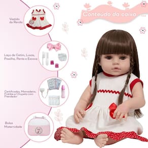 A nossa empresa tem a missão de garantir a total satisfação de seus clientes, onde a qualidade e o atendimento excepcional são nossa prioridade Estamos muito felizes em apresentar a Boneca Bebê Reborn para você, um item cuidadosamente selecionado para atender às suas necessidades. Compre agora e experimente a diferença em comprar com a nossa loja.A Boneca Bebê Reborn é o sonho das crianças Produzida 100% em vinil siliconado, essa boneca pode sentar, deitar e fazer tudo que a sua imaginação deixar. Com seus olhos castanhos e detalhes realistas ela é encantadora e apaixonante. Sua criança merece a melhor qualidade de bebê reborn Marca: Cegonha Reborn DollsModelo: Boneca Bebê Reborn Cor: BegeMaterial: Vinil Siliconado AtóxicoCaracterísticas Principais: Membros Articulados, Corpo de Silicone, Detalhes Realistas.Medidas Aprox.: Altura da Boneca: 46cm Peso Aprox. Da Boneca: 0,745 Kg Certificado INMETRO Recomendado para crianças maiores de 03 anosConteúdo:1 Bebê Reborn Cabeça, Membros e Corpo de Vinil 1 Vestido1 Par de Cílios1 Par de Brinco1 Chupeta 1 Mamadeira Simples5 Certificados3 Fraldas1 Laço Cetim2 Presilhinha1 Par de Luvas1 Bolsa Maternidade1 Prendedor de ChupetaKit Pente e Escova SimplesGarantia30 dias de garantia oferecida pelo fabricante.Dúvidas Frequentes:1. Ela acompanha ItensR. Sim, todos os itens da descrição.2. Ela emite algum somR. Não, ela não emite nenhum som.3. Pode dar banho na bonecaR. Sim, pois o material do corpo é de Silicone.4. Pode escolher a cor dos olhos da bonecaR. Não, os olhos já vêm de fábrica.Tags: Realista, Menina, Infantil, Silicone, Princesa, Linda, Morena, Loira, Fofa, Banho, Enxoval, Completo, Grande, Baby Alive.Homologação Inmetro: IP-BRI-2749/2021-01