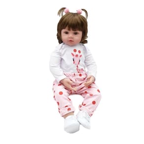 2 descrição do produto: Corpo: silicone Cor da pele: branca Tamanho: 48 cm aproximadamente Peso: cerca de 900 gramas aproximadamente Olhos: castanhos em acrílico Sexo: feminino com genitália. Cabelos: prótese peruquinha colada material sintético . Sobrancelhas: pintura artística. Pode dar banho, sentar e deitar.