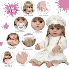 A nossa empresa tem a missão de garantir a total satisfação de seus clientes, onde a qualidade e o atendimento excepcional são nossa prioridade Estamos muito felizes em apresentar a Boneca Bebê Reborn para você, um item cuidadosamente selecionado para atender às suas necessidades. Compre agora e experimente a diferença em comprar com a nossa loja.A Boneca Bebê Reborn é o sonho das meninas Produzida 100% em vinil siliconado, essa boneca pode sentar, deitar e fazer tudo que a sua imaginação deixar. Com seus olhos castanhos e detalhes realistas ela é encantadora e apaixonante. Sua criança merece a melhor qualidade de bebê reborn Marca: Cegonha Reborn DollsModelo: Boneca Bebê Reborn Cor: BegeMaterial: Vinil Siliconado AtóxicoCaracterísticas Principais: Membros Articulados, Corpo de Silicone, Detalhes Realistas.Medidas Aprox.: Altura da Boneca: 46cm Peso Aprox. Da Boneca: 0,745 Kg Certificado INMETRO Recomendado para crianças maiores de 03 anosConteúdo:1 Bebê Reborn Cabeça, Membros e Corpo de Vinil 1 Conjunto de Roupa Luxo1 Par de Cílios1 Par de Brinco1 Chupeta 1 Mamadeira Simples5 Certificados3 Fraldas1 Laço Cetim2 Presilhinha1 Par de Luvas1 Bolsa Maternidade1 Prendedor de ChupetaKit Pente e Escova SimplesGarantia30 dias de garantia oferecida pelo fabricante.Dúvidas Frequentes:1. Ela acompanha ItensR. Sim, todos os itens da descrição.2. Ela emite algum somR. Não, ela não emite nenhum som.3. Pode dar banho na bonecaR. Sim, pois o material do corpo é de Silicone.4. Pode escolher a cor dos olhos da bonecaR. Não, os olhos já vêm de fábrica.Tags: Realista, Menina, Infantil, Silicone, Princesa, Linda, Morena, Loira, Fofa, Banho, Enxoval, Completo, Grande, Baby Alive.Homologação Inmetro: IP-BRI-8778/2018-06