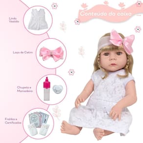 Conteúdo: 1 Bebê Reborn Cabeça, Membros e Corpo de Vinil 1 Vestido 1 Par de Cílios 1 Par de Brincos 1 Chupeta 1 Mamadeira Simples 5 Certificados 2 Fraldas 1 Laço Cetim