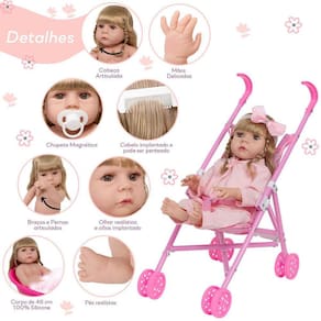A Boneca Bebê Reborn é o sonho das crianças Produzida 100% em vinil siliconado, essa boneca pode sentar, deitar e fazer tudo que a sua imaginação deixar. Com seus olhos castanhos e detalhes realistas ela é encantadora e apaixonante. Acompanha um lindo carrinho para poder passear com o bebê. Sua criança merece a melhor qualidade de bebê reborn