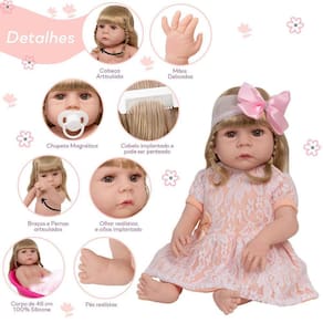 A Boneca Bebê Reborn é o sonho das crianças Produzida 100% em vinil siliconado, essa boneca pode sentar, deitar e fazer tudo que a sua imaginação deixar. Com seus olhos castanhos e detalhes realistas ela é encantadora e apaixonante. Sua criança merece a melhor qualidade de bebê reborn