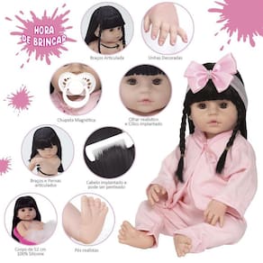 A nossa empresa tem a missão de garantir a total satisfação de seus clientes, onde a qualidade e o atendimento excepcional são nossa prioridade Estamos muito felizes em apresentar a Boneca Bebê Reborn para você, um item cuidadosamente selecionado para atender às suas necessidades. Compre agora e experimente a diferença em comprar com a nossa loja.A Boneca Bebê Reborn é o sonho das meninas Produzida 100% em vinil siliconado, essa boneca pode sentar, deitar e fazer tudo que a sua imaginação deixar. Com seus olhos castanhos e detalhes realistas ela é encantadora e apaixonante. Sua criança merece a melhor qualidade de bebê reborn Marca: Cegonha Reborn DollsModelo: Boneca Bebê Reborn Cor: BegeMaterial: Vinil Siliconado AtóxicoCaracterísticas Principais: Membros Articulados, Corpo de Silicone, Detalhes Realistas.Medidas Aprox.: Altura da Boneca: 52cm Peso Aprox. Da Boneca: 0,745 Kg Certificado INMETRO Recomendado para crianças maiores de 03 anosConteúdo:1 Bebê Reborn Cabeça, Membros e Corpo de Vinil 1 Conjunto Pagão Rosa com Roupa Saida de Banho1 Par de Cílios1 Par de Brinco1 Chupeta1 Mamadeira Simples5 Certificados2 Fraldas1 Laço CetimGarantia30 dias de garantia oferecida pelo fabricante.Dúvidas Frequentes:1. Ela acompanha ItensR. Sim, todos os itens da descrição.2. Ela emite algum somR. Não, ela não emite nenhum som.3. Pode dar banho na bonecaR. Sim, pois o material do corpo é de Silicone.4. Pode escolher a cor dos olhos da bonecaR. Não, os olhos já vêm de fábrica.Tags: Boneca, Bebe, Reborn, Realista, Menina, Infantil, Silicone, Princesa, Linda, Morena, Loira, Fofa, Banho, Enxoval, Completo, Grande, Baby Alive.Homologação Inmetro: IP-BRI-0406/2022-07