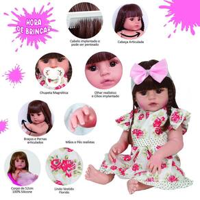 A Boneca Bebê Reborn é o sonho das meninas Produzida 100% em vinil siliconado, essa boneca pode sentar, deitar e fazer tudo que a sua imaginação deixar. Com seus olhos castanhos e detalhes realistas ela é encantadora e apaixonante. Sua criança merece a melhor qualidade de bebê reborn