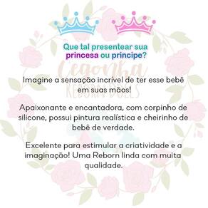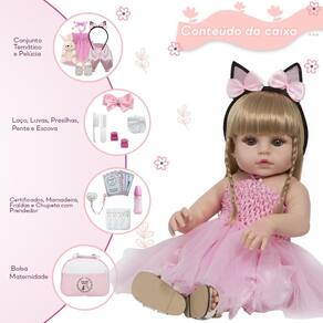 conteúdo: 1 bebê reborn cabeça, membros e corpo de vinil 1 conjunto roupa bailarina 1 par de cílios 1 par de brinco 1 chupeta 1 mamadeira simples 5 certificados 3 fraldas 1 laço cetim 2 presilhinha 1 par de luvas 1 bolsa maternidade 1 prendedor de chupeta kit pente e escova simples 1 pelúcia cor 1 par de sandálias