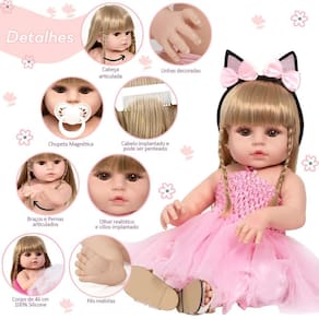 dúvidas frequentes: 1. Ela acompanha itens r. Sim, todos os itens da descrição. 2. Ela emite algum som r. Não, ela não emite nenhum som. 3. Pode dar banho na boneca r. Sim, pois o material do corpo é de silicone. 4. Pode escolher a cor dos olhos da boneca r. Não, os olhos já vêm de fábrica. Homologação inmetro: ip-bri-0261/2022-05
