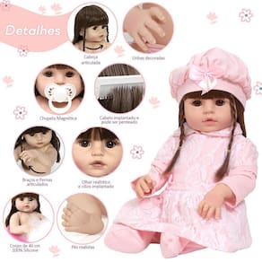 A Boneca Bebê Reborn é o sonho das crianças Produzida 100% em vinil siliconado, essa boneca pode sentar, deitar e fazer tudo que a sua imaginação deixar. Com seus olhos castanhos e detalhes realistas ela é encantadora e apaixonante. Sua criança merece a melhor qualidade de bebê reborn
