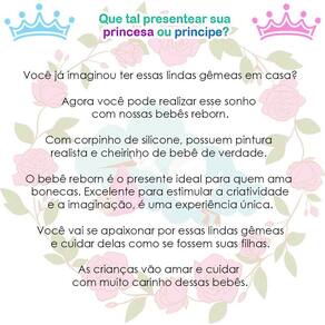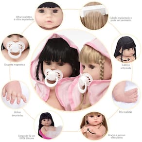 A nossa empresa tem a missão de garantir a total satisfação de seus clientes, onde a qualidade e o atendimento excepcional são nossa prioridade Estamos muito felizes em apresentar as Boneca Bebê Reborn Gêmeas para você, um produto cuidadosamente selecionado para atender às suas necessidades. Compre agora e experimente a diferença em comprar com a nossa loja.As Bonecas Bebê Reborn Gêmeas são o sonho das meninas Produzida 100% em vinil siliconado, essas bonecas podem sentar, deitar e fazer tudo que a sua imaginação deixar. Com seus olhos castanhos e detalhes realistas elas são encantadoras e apaixonantes. Sua criança merece a melhor qualidade de bebê reborn Marca: Cegonha Reborn DollsModelo: Boneca Bebê Reborn GêmeasCor: BegeMaterial: Vinil Siliconado AtóxicoCaracterísticas Principais: Membros Articulados, Corpo de Silicone, Detalhes Realistas.Medidas Aprox.: Altura da Boneca: 46cm Peso Aprox. Da Boneca: 0,745 Kg Certificado INMETRO Recomendado para crianças maiores de 03 anosConteúdo:2 Bebê Reborn Cabeça, Membros e Corpo de Vinil 2 Saída de Banho2 Par de Cílios2 Par de Brinco2 Chupeta2 Mamadeira Simples10 Certificados4 Fraldas2 Laço CetimGarantia30 dias de garantia oferecida pelo fabricante.Dúvidas Frequentes:1. Elas acompanham ItensR. Sim, todos os itens da descrição.2. Elas emitem algum somR. Não, elas não emitem nenhum som.3. Pode dar banho na bonecaR. Sim, pois o material do corpo é de Silicone.4. Pode escolher a cor dos olhos da bonecaR. Não, os olhos já vêm de fábrica.Tags: Realista, Menina, Infantil, Silicone, Princesa, Linda, Morena, Loira, Fofa, Banho, Enxoval, Completo, Grande, Baby Alive.Homologação Inmetro: IP-BRI-0261/2022-05