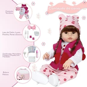 A nossa empresa tem a missão de garantir a total satisfação de seus clientes, onde a qualidade e o atendimento excepcional são nossa prioridade Estamos muito felizes em apresentar a Boneca Bebê Reborn Girafinha para você, um item cuidadosamente selecionado para atender às suas necessidades. Compre agora e experimente a diferença em comprar com a nossa loja.A Boneca Bebê Reborn Girafinha é o sonho das meninas Produzida 100% em vinil siliconado, essa boneca pode sentar, deitar e fazer tudo que a sua imaginação deixar. Com seus olhos castanhos e detalhes realistas ela é encantadora e apaixonante. Sua criança merece a melhor qualidade de bebê reborn Marca: Cegonha Reborn DollsModelo: Boneca Bebê Reborn GirafinhaCor: BegeMaterial: Vinil Siliconado AtóxicoCaracterísticas Principais: Membros Articulados, Corpo de Silicone, Detalhes Realistas.Medidas Aprox.: Altura da Boneca: 46cm Peso Aprox. Da Boneca: 0,745 Kg Certificado INMETRO Recomendado para crianças maiores de 03 anosConteúdo:1 Bebê Reborn Cabeça, Membros e Corpo de Vinil 1 Conjunto de Roupa Girafinha1 Par de Cílios1 Par de Brinco1 Dispositivo de choro1 Chupeta 1 Mamadeira Simples5 Certificados3 Fraldas1 Laço Cetim2 Presilhinha1 Par de Luvas1 Bolsa Maternidade1 Prendedor de Chupeta1 Kit Pente e Escova Simples1 Par de Sapatinhos1 PelúciaGarantia30 dias de garantia oferecida pelo fabricante.Dúvidas Frequentes:1. Ela acompanha ItensR. Sim, todos os itens da descrição.2. Ela emite algum somR. Sim, ela fala 30 frases.3. Pode dar banho na bonecaR. Não, pois contém dispositivo de choro.4. Pode escolher a cor dos olhos da bonecaR. Não, os olhos já vêm de fábrica.Tags: Realista, Menina, Infantil, Silicone, Bailarina, Princesa, Linda, Fofa, Banho, Enxoval, Completo, Grande, Baby.Homologação Inmetro: CE-BRI/ICEPEX-N 01330-82-3
