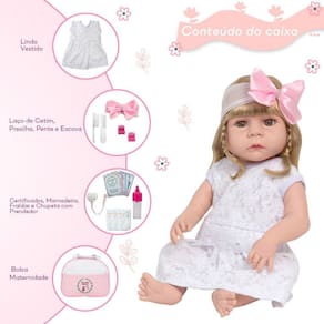 Conteúdo: 1 Bebê Reborn Cabeça, Membros e Corpo de Vinil 1 Vestido 1 Par de Cílios 1 Par de Brincos 1 Chupeta 1 Mamadeira Simples 5 Certificados 3 Fraldas 1 Laço Cetim 2 Presilhinha 1 Par de Luvas 1 Bolsa Maternidade 1 Prendedor de Chupeta Kit Pente e Escova Simples