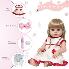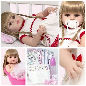 A nossa empresa tem a missão de garantir a total satisfação de seus clientes, onde a qualidade e o atendimento excepcional são nossa prioridade Estamos muito felizes em apresentar a Boneca Bebê Reborn para você, um item cuidadosamente selecionado para atender às suas necessidades. Compre agora e experimente a diferença em comprar com a nossa loja.A Boneca Bebê Reborn é o sonho das crianças Produzida 100% em vinil siliconado, essa boneca pode sentar, deitar e fazer tudo que a sua imaginação deixar. Com seus olhos castanhos e detalhes realistas ela é encantadora e apaixonante. Sua criança merece a melhor qualidade de bebê reborn Marca: Cegonha Reborn DollsModelo: Boneca Bebê Reborn Cor: BegeMaterial: Vinil Siliconado AtóxicoCaracterísticas Principais: Membros Articulados, Corpo de Silicone, Detalhes Realistas.Medidas Aprox.: Altura da Boneca: 46cm Peso Aprox. Da Boneca: 0,745 Kg Certificado INMETRO Recomendado para crianças maiores de 03 anosConteúdo:1 Bebê Reborn Cabeça, Membros e Corpo de Vinil 1 Vestido1 Par de Cílios1 Par de Brinco1 Chupeta1 Mamadeira Simples5 Certificados2 Fraldas1 Laço CetimGarantia30 dias de garantia oferecida pelo fabricante.Dúvidas Frequentes:1. Ela acompanha ItensR. Sim, todos os itens da descrição.2. Ela emite algum somR. Não, ela não emite nenhum som.3. Pode dar banho na bonecaR. Sim, pois o material do corpo é de Silicone.4. Pode escolher a cor dos olhos da bonecaR. Não, os olhos já vêm de fábrica.Tags: Realista, Menina, Infantil, Silicone, Princesa, Linda, Morena, Loira, Fofa, Banho, Enxoval, Completo, Grande, Baby Alive.Homologação Inmetro: 0205/21-BQ-01