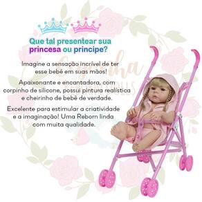 Conteúdo: 1 Bebê Reborn Cabeça, Membros e Corpo de Vinil 1 Saída de Banho 1 Par de Cílios 1 Par de Brincos 1 Chupeta 1 Mamadeira Simples 5 Certificados 2 Fraldas 1 Laço Cetim 1 Carrinho