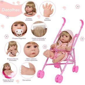 A Boneca Bebê Reborn é o sonho das crianças Produzida 100% em vinil siliconado, essa boneca pode sentar, deitar e fazer tudo que a sua imaginação deixar. Com seus olhos castanhos e detalhes realistas ela é encantadora e apaixonante. Acompanha um lindo carrinho para poder passear com o bebê. Sua criança merece a melhor qualidade de bebê reborn