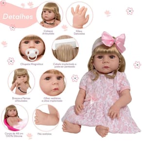 A Boneca Bebê Reborn é o sonho das crianças Produzida 100% em vinil siliconado, essa boneca pode sentar, deitar e fazer tudo que a sua imaginação deixar. Com seus olhos castanhos e detalhes realistas ela é encantadora e apaixonante. Sua criança merece a melhor qualidade de bebê reborn