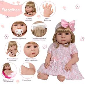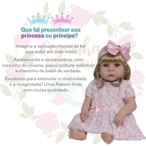 A Boneca Bebê Reborn é o sonho das crianças Produzida 100% em vinil siliconado, essa boneca pode sentar, deitar e fazer tudo que a sua imaginação deixar. Com seus olhos castanhos e detalhes realistas ela é encantadora e apaixonante. Sua criança merece a melhor qualidade de bebê reborn
