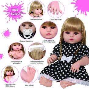 A nossa empresa tem a missão de garantir a total satisfação de seus clientes, onde a qualidade e o atendimento excepcional são nossa prioridade Estamos muito felizes em apresentar a Boneca Bebê Reborn para você, um item cuidadosamente selecionado para atender às suas necessidades. Compre agora e experimente a diferença em comprar com a nossa loja.A Boneca Bebê Reborn é o sonho das meninas Produzida 100% em vinil siliconado, essa boneca pode sentar, deitar e fazer tudo que a sua imaginação deixar. Com seus olhos castanhos e detalhes realistas ela é encantadora e apaixonante. Sua criança merece a melhor qualidade de bebê reborn Marca: Cegonha Reborn DollsModelo: Boneca Bebê RebornCor: BegeMaterial: Vinil Siliconado AtóxicoCaracterísticas Principais: Membros Articulados, Corpo de Silicone, Detalhes Realistas.Medidas Aprox.: Altura da Boneca: 46cm Peso Aprox. Da Boneca: 0,745 Kg Certificado INMETRO Recomendado para crianças maiores de 03 anosConteúdo:1 Bebê Reborn Cabeça, Membros e Corpo de Vinil 1 Vestido1 Par de Cílios1 Par de Brinco1 Chupeta1 Mamadeira Simples5 Certificados2 Fraldas1 Laço CetimGarantia30 dias de garantia oferecida pelo fabricante.Dúvidas Frequentes:1. Ela acompanha ItensR. Sim, todos os itens da descrição.2. Ela emite algum somR. Não, ela não emite nenhum som.3. Pode dar banho na bonecaR. Sim, pois o material do corpo é de Silicone.4. Pode escolher a cor dos olhos da bonecaR. Não, os olhos já vêm de fábrica.Tags: Realista, Menina, Infantil, Silicone, Princesa, Linda, Morena, Loira, Fofa, Banho, Enxoval, Completo, Grande, Baby Alive.Homologação Inmetro: IP-BRI-0261/2022-05