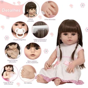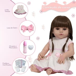 A Boneca Bebê Reborn é o sonho das crianças Produzida 100% em vinil siliconado, essa boneca pode sentar, deitar e fazer tudo que a sua imaginação deixar. Com seus olhos castanhos e detalhes realistas ela é encantadora e apaixonante. Sua criança merece a melhor qualidade de bebê reborn