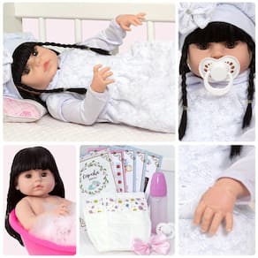 A Boneca Bebê Reborn é o sonho das crianças Produzida 100% em vinil siliconado, essa boneca pode sentar, deitar e fazer tudo que a sua imaginação deixar. Com seus olhos castanhos e detalhes realistas ela é encantadora e apaixonante. Sua criança merece a melhor qualidade de bebê reborn
