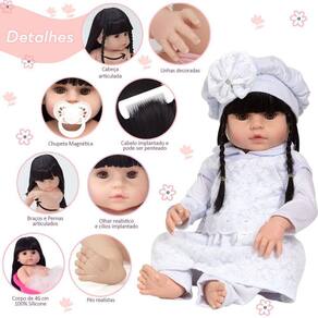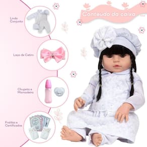 A Boneca Bebê Reborn é o sonho das crianças Produzida 100% em vinil siliconado, essa boneca pode sentar, deitar e fazer tudo que a sua imaginação deixar. Com seus olhos castanhos e detalhes realistas ela é encantadora e apaixonante. Sua criança merece a melhor qualidade de bebê reborn
