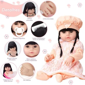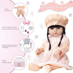 A Boneca Bebê Reborn é o sonho das crianças Produzida 100% em vinil siliconado, essa boneca pode sentar, deitar e fazer tudo que a sua imaginação deixar. Com seus olhos castanhos e detalhes realistas ela é encantadora e apaixonante. Sua criança merece a melhor qualidade de bebê reborn