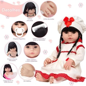 A Boneca Bebê Reborn é o sonho das crianças Produzida 100% em vinil siliconado, essa boneca pode sentar, deitar e fazer tudo que a sua imaginação deixar. Com seus olhos castanhos e detalhes realistas ela é encantadora e apaixonante. Sua criança merece a melhor qualidade de bebê reborn
