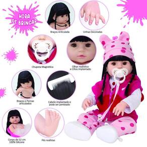 A nossa empresa tem a missão de garantir a total satisfação de seus clientes, onde a qualidade e o atendimento excepcional são nossa prioridade Estamos muito felizes em apresentar a Boneca Bebê Reborn Girafinha para você, um item cuidadosamente selecionado para atender às suas necessidades. Compre agora e experimente a diferença em comprar com a nossa loja.A Boneca Bebê Reborn Girafinha é o sonho das meninas Produzida 100% em vinil siliconado, essa boneca pode sentar, deitar e fazer tudo que a sua imaginação deixar. Com seus olhos castanhos e detalhes realistas ela é encantadora e apaixonante. Sua criança merece a melhor qualidade de bebê reborn Marca: Cegonha Reborn DollsModelo: Boneca Bebê Reborn GirafinhaCor: BegeMaterial: Vinil Siliconado AtóxicoCaracterísticas Principais: Membros Articulados, Corpo de Silicone, Detalhes Realistas.Medidas Aprox.: Altura da Boneca: 52cm Peso Aprox. Da Boneca: 0,745 Kg Certificado INMETRO Recomendado para crianças maiores de 03 anosConteúdo:1 Bebê Reborn Cabeça, Membros e Corpo de Vinil 1 Conjunto de Roupa Girafinha1 Par de Cílios1 Par de Brinco1 Chupeta com Artesanato1 Mamadeira Luxo5 Certificados3 Fraldas1 Laço Cetim2 Presilhinha1 Par de Luvas1 Bolsa Maternidade1 Prendedor de ChupetaKit Pente e Escova com Artesanato1 Kit medico1 Sapatinho c Laço1 Kit Panelinha 1 Par de Sapatinhos1 PelúciaGarantia30 dias de garantia oferecida pelo fabricante.Dúvidas Frequentes:1. Ela acompanha ItensR. Sim, todos os itens da descrição.2. Ela emite algum somR. Não, ela não emite nenhum som.3. Pode dar banho na bonecaR. Sim, pois o material do corpo é de Silicone.4. Pode escolher a cor dos olhos da bonecaR. Não, os olhos já vêm de fábrica.Tags: Boneca, Bebe, Reborn, Realista, Menina, Infantil, Silicone, Bailarina, Princesa, Linda, Morena, Loira, Fofa, Banho, Enxoval, Completo, Grande, Baby Alive.Homologação Inmetro: 0205/21-BQ-01
