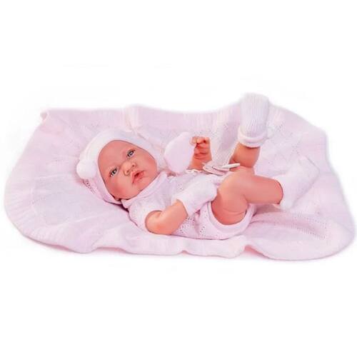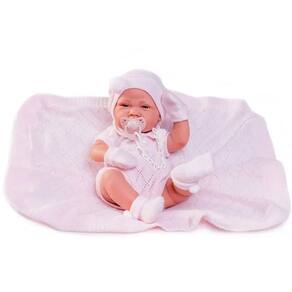 Com 42 cm de altura, a Boneca RN Lua vem com um delicado conjunto em tricô rosa, manta branca aconchegante e acessórios encantadores como gorro, luvinhas, sapatinhos e uma chupeta com corrente.