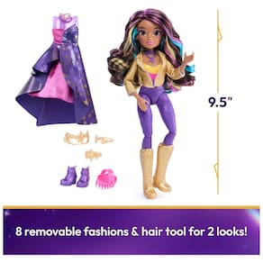 Leve para casa a boneca de luxo Sophia Masquerade da Unicorn Academy Com roupas autênticas, cabelo macio e 9 pontos de articulação, esta boneca deluxe oficial é baseada no popular programa infantil best seller da NETFLIX. Além disso, Sophia vem com 9 acessórios para boneca, incluindo um equipamento de montaria, roupas de boneca, jaqueta, botas, colar, vestido assimétrico, máscara, botinhas roxas com cinto dourado e uma ferramenta de modelagem de cabelo.