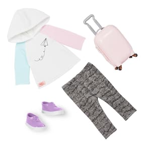 Boneca com acessórios de viagem. Tem olhos castanhos, cabelo preto, longo e cacheado. Já vem pronta para viajar, com passaporte, cartão de embarque, guloseimas e uma linda mala que abre e fecha, para guardar tudo.
