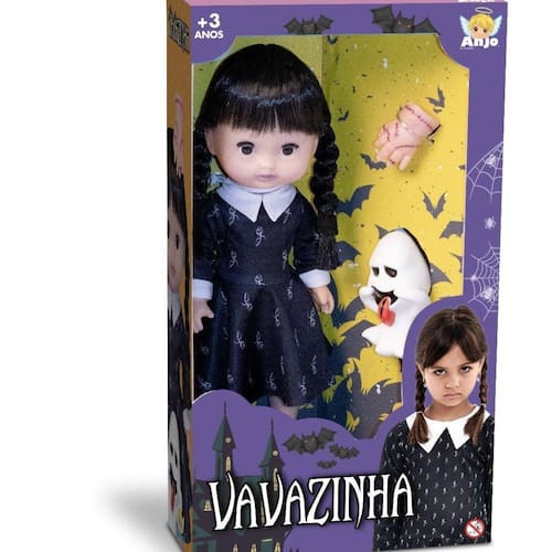 Boneca vavazinha com mãozinha e fantasminha inspiração série wandinha Boneca vavazinha com mãozinha e fantasma inspiração séria wandinha essa boneca inspirada na wandinha, veio para tornar suas brincadeiras ainda mais divertidas. Feita com ricos detalhes da personagem, com franjinha e roupinha toda preta, traz todo encanto e diversão que encontramos na série. A boneca tem 30cm de comprimento com corpinho emborrachado e articulado, feita em borracha macia não trás riscos em machucar a criança. além disso, vêm acompanhada de sua amiga inseparável, a mãozinha e também com um fantasminha, ambos feitos em borracha macia, deixando a brincadeira ainda mais completa. Solte a imaginação e leve sua companheira para onde for. fabricados com materiais de alta qualidade, essa boneca é durável e resistente para garantir muitas horas de diversão.Especificações:material: polietileno, vinil e roupa em tecido tamanho: boneca - 31cm altura x 13cm largura / mãozinha - 5,5cm altura x 2,5cm largura / fantasminha - 10cm altura x 6cm largurapeso: 350g aprox.Idade: acima de +3 anos inmetro ce-bri/qb 4115nm 300/2002 Inspiração da série wandinha contém:01 boneca vavazinha com mãozinha e fantasminha Ean: 7898064927462