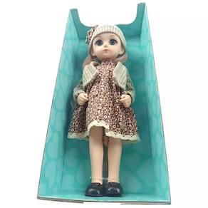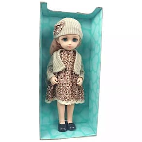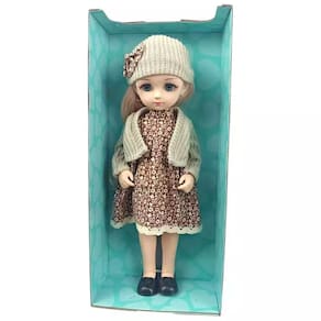 Com aproximadamente 35 cm de altura, a boneca vem vestida com um lindo vestido estampado, cardigã de tricô e gorro combinando, prontos para brincar de moda e imaginação.