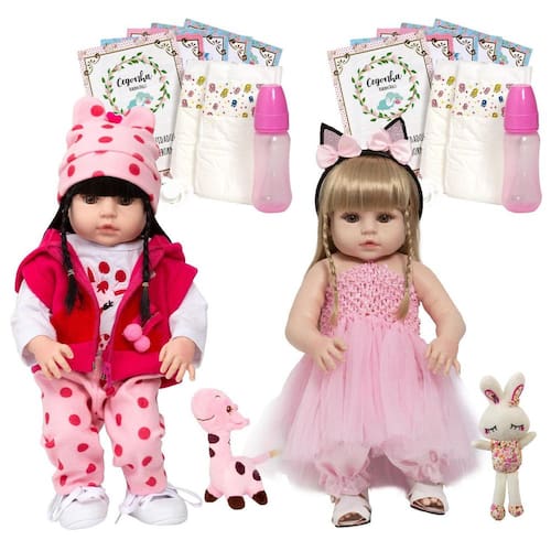 Bonecas Bebê Reborn Gêmeas Girafinha Coelhinha Enxoval 28 Itens - Cegonha Reborn Dolls As Bonecas Bebê Reborn Gêmeas Girafinha Coelhinha são o sonho de todas as meninas! Produzidas pela renomada marca Cegonha Reborn Dolls, essas bonecas são feitas com vinil siliconado atóxico de alta qualidade, garantindo a melhor experiência para as crianças. Com seus detalhes realistas e olhos castanhos encantadores, as Bonecas Bebê Reborn Gêmeas são irresistíveis. Elas podem sentar, deitar e fazer tudo o que a imaginação permitir. Com membros articulados e corpo de silicone, essas bonecas são muito próximas da realidade. Medindo aproximadamente 46cm de altura e pesando cerca de 0,745kg, as Bonecas Bebê Reborn Gêmeas são perfeitas para crianças maiores de 03 anos. Elas vêm acompanhadas de um conjunto de roupa girafinha e um conjunto de roupa coelhinha, além de dois pares de cílios, dois pares de brincos, duas chupetas, duas mamadeiras simples, dez certificados, quatro fraldas, um par de sapatinhos e um par de sandalinhas. E para deixar tudo ainda mais especial, as bonecas vêm acompanhadas de duas pelúcias . Essas bonecas são certificadas pelo INMETRO, garantindo a sua segurança e qualidade. Elas não emitem nenhum som e podem ser banhadas, pois o material do corpo é de silicone. Vale ressaltar que os olhos das bonecas não podem ser escolhidos, pois já vêm de fábrica. Garanta agora mesmo as Bonecas Bebê Reborn Gêmeas Girafinha Coelhinha com enxoval completo de 28 itens e proporcione momentos de diversão e encanto para as crianças. Compre já e experimente a diferença de adquirir um produto de alta qualidade com a nossa loja. Palavras-chave: Reborn, Realista, Menina, Infantil, Silicone, Princesa, Linda, Morena, Loira, Fofa, Banho, Enxoval, Completo, Grande. Homologação Inmetro: CE-BRI/IQB 006042 54693/21-001