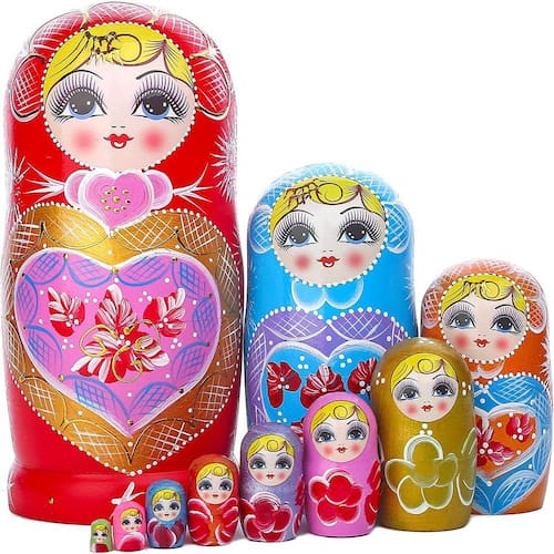 Olhe para esta linda e requintada boneca matryoshka! Os detalhes faciais, como os olhos grandes e a pequena boca vermelha, podem ser vistos claramente em todas as bonecas de cada camada, de grandes a pequenas, o que é algo difícil de experimentar em outras lojas. É porque adotamos o mais recente trabalho de pintura e resolvemos perfeitamente o problema nas técnicas tradicionais de pintura que quanto menor a boneca, mais grosseiros são os detalhes.