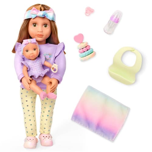 As bonecas Our Generation Tory e Riley são perfeitas para crianças que adoram brincar de cuidar e imaginar histórias cheias de amor. A Tory é a irmã mais velha, sempre pronta para cuidar da pequena Riley, sua adorável irmã bebê. Juntas, elas formam uma dupla encantadora, com roupas combinando em tons pastel e acessórios que tornam a brincadeira ainda mais completa. A Tory vem com uma linda tiara com laço, blusa lilás estilosa com detalhes nos ombros, calça com estampa de corações e sapatinhos. Já a Riley usa um body roxo com babadinhos e uma faixa de cabelo combinando, trazendo ainda mais charme ao conjunto.