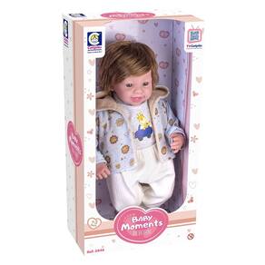 A Boneca Baby Moments Reborn Menino é uma boneca realisticamente detalhada, projetada para simular a aparência de um bebê recém-nascido. Ela possui características faciais delicadas e expressivas, com olhos grandes e realistas, cabelos que imitam fios de cabelo de verdade. A pele é feita de vinil macio, proporcionando uma sensação realista ao toque.