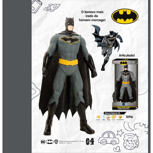 Boneco Batman 45 cm Articulado Rosita 1096 Chegou o boneco mais irado do homem morcego, Boneco Batman da Rosita Agora a criançada poderá ter seu personagem favorito sempre ao seu lado. Produzido em vinil, possui 45 cm de altura, ele representa de forma um dos personagens mais icônicos da DC Comics. O boneco possui 4 pontos de articulação e detalhes com o mesmo estilo dos quadrinhos. Faça parte do universo dos quadrinhos DC Comics e prepare-se para batalhas incríveis. Conteúdo da embalagem: 01 Boneco Batman Não possui acessórios. Dimensões da embalagem é de 10x22x48 cm Fabricante: Novabrink. Produto com nota fiscal, direto para a sua casa. Prazo de envio: em até 24 horas Faixa Etária: A partir de 3 anos Composição: Brinquedo composto por vinil e tecido SKU: 1096 Produto Mecanizado: Não Produto Articulado: Sim Peso do produto na embalagem: 0,750 gr Certificado do INMETRO: Registro 004582/2019 OCP 0061 As cores do produto, podem variar do apresentado nas ilustrações ou nas fotografias da embalagem. Fotos meramente ilustrativas.Boneco Batman 45 cm Articulado Rosita Marca: Taiwan Collection
