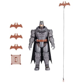 Arme o Batman com batarangs, rede ou gancho! Com esses 5 acessórios, você pode continuar carregando-os nas mãos do Batman, puxar as pernas para trás e lançar-se nos Super-Vilões. Batman também pode dar um soco se nada estiver em sua mão. A ação de arremesso real permite que você lute contra o crime e proteja Gotham City! Pressione o peito do Batman para ativar mais de 15 sons e frases diferentes.